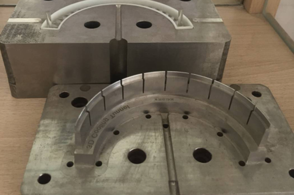 模具簡述: 模具共3個工件使用增材制造技術成型:上內模、下內模、尖點熱唧嘴套 材質:1.2709 硬度:上內模、熱唧嘴套 HRC52,下內模 HRC50 型芯表面:火花紋效果